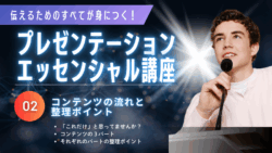 セレクト プレゼンテーション・エッセンシャル講座—―2 コンテンツの流れと整理ポイント 「コンテンツ」とはプレゼンの中身そのものです。そこにはしっかりとした構成が必要です。「伝わる」内容にするために必要な要素を理解しておきましょう。AUDIO(トータル時間 (03:39)TEXTコンテンツの3パートコンテンツは3つのパートがあ... セレクト